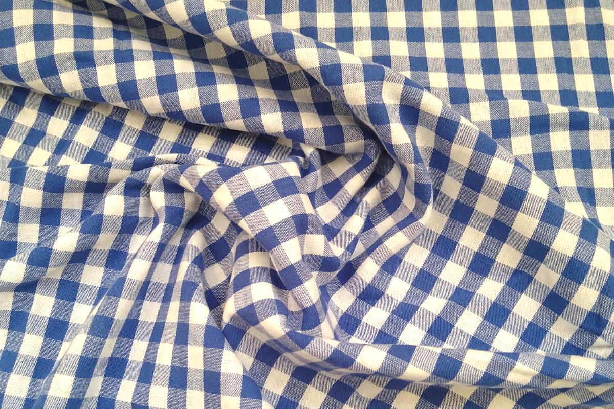 Sinivalkoinen ruutukangas 100 % puuvillaa.